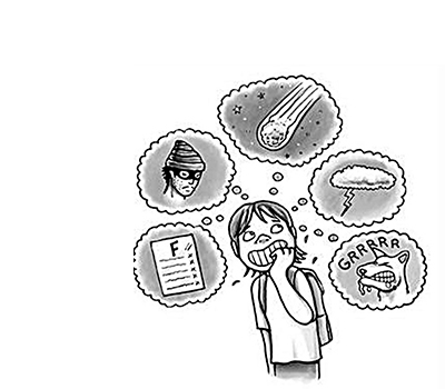 Preocupação intensa, excessiva e persistente e medo de situações cotidianas. Podem ocorrer frequência cardíaca elevada, respiração rápida, sudorese e sensação de cansaço.